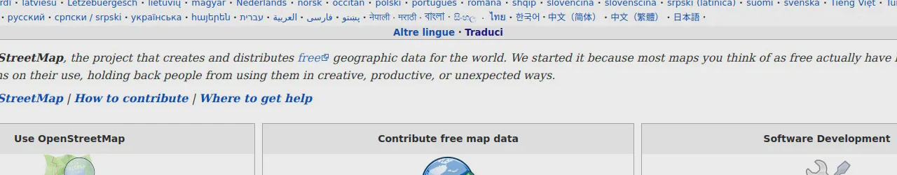 Diversamente da Wikipedia dove le traduzioni sono su un “contenitore” differente, il wiki di OpenStreetMap è stato impostato in modo che le traduzioni siano concentrate in un unico sistema e collegate tra loro. Per questo è scritto come si fa: